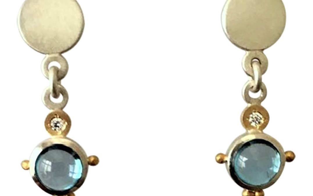 A silver disc suspends a round gold setting, delicately holding a sparkling diamond. From this, a cabochon Blue Topaz gem gracefully drops, its setting adorned with fine gold granules on the side and base. It’s a dainty sweet design.