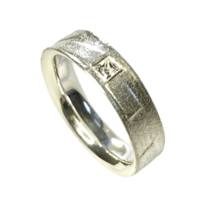 The Crisp white Diamond ring features a square diamond set using a classic Gypsy setting. In this setting, the gem sits flush with the surface of the metal and is fully enclosed. One of the most secure settings is the Gypsy setting, which features no protrusions. The stone won’t catch or snag, making it ideal for daily wear.