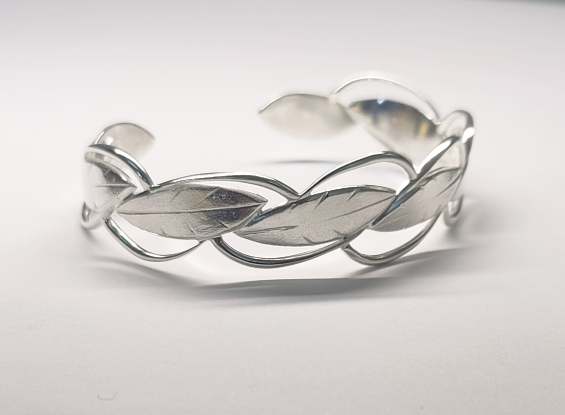 The Leaf Design Cuff, meticulously crafted in sterling silver, fuses organic shapes with a strong sculptural form. The design makes it a statement piece, perfect for everyday wear.