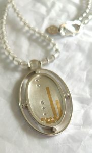 Rock crystal diamond pendant. A striking design featuring frosted Rock Crystal beads and a pendant set with sparkling diamonds. The piece is enriched with 24ct gold highlights, beautifully balanced with pure silver and sterling silver for a refined finish. This pendant is a One-Off piece.